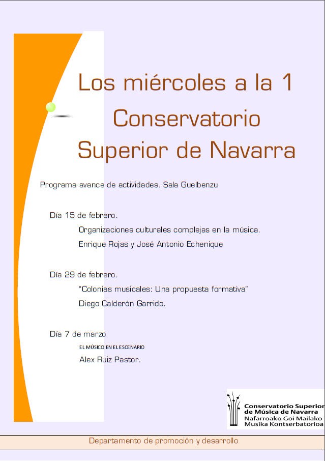 Dentro de las actividades “Los miércoles a la 1“ organizadas desde el Departamento de Promoción y Desarrollo del Conservatorio Superior de Música de Navarra, este próximo miércoles día 15 de febrero a las 13 horas estarán dos grandes gestores de la música , Enrique Rojas y José Antonio Echenique. El tema “ Organizaciones culturales complejas, orquesta, festival”.