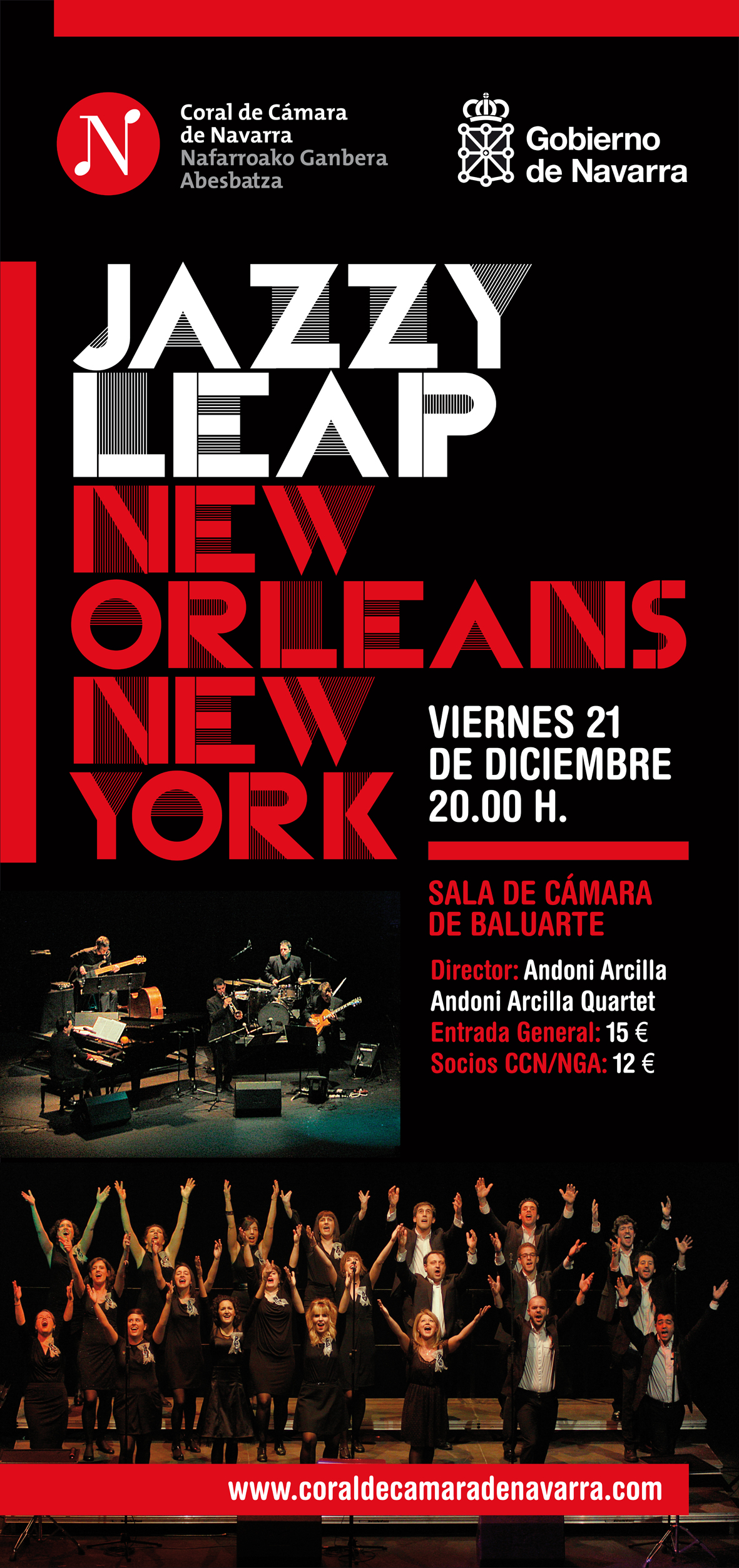 Jazzy Leap no para, en un mes nos va a ofrecer tres conciertos diferentes. Tras su exitoso The Swing, puesto de largo en el Auditorio Civivox Iturrama el pasado mes de noviembre, la sección de Jazz de la Coral de Cámara de Navarra vuelve con fuerza con un espectaculo titulado «New Orleans-New York». El conjunto dirigido por Andoni Arcilla, estará acompañado por el Andoni Arcilla Quartet compuesto por Jorge Abadías (guitarra), Kike Arza (contrabajo), Juanma Urriza (bateria)y el propio Andoni Arcilla a la voz y piano.