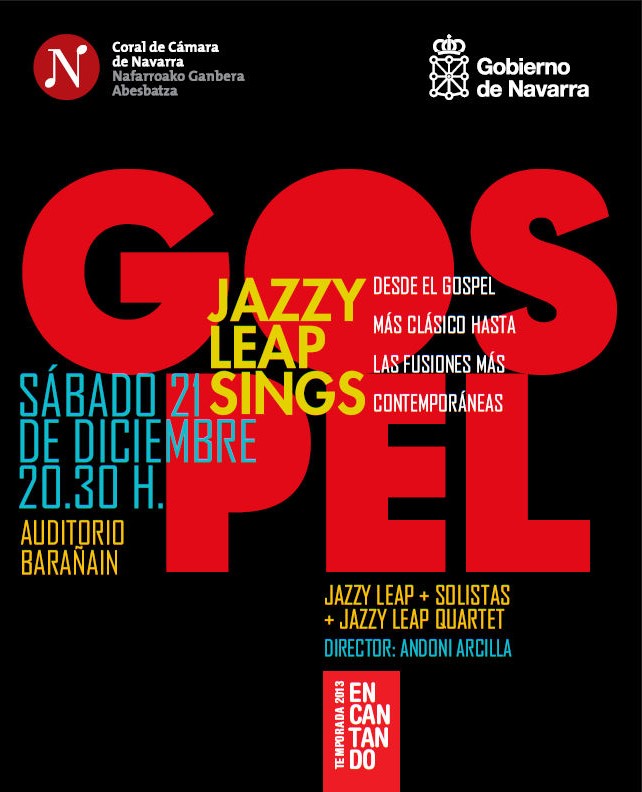 Jazzy Leap, sección de Jazz y Música Moderna de la Coral de Cámara de Navarra/Nafarroako Ganbera Abesbatza despedirá el año con un concierto dedicado al género GOSPEL, un recorrido por el gospel más clásico pasando por las fusiones más contemporáneas. El concierto estará dirigida por Andoni Arcilla.